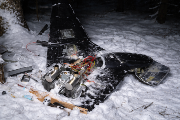 На кадрах видно, как аппарат упал в снег. Минобороны сообщает, что дрон нёс фугасный заряд массой 6 килограммов. Кроме того, запись показывает электронику, проводку и фрагменты корпуса.